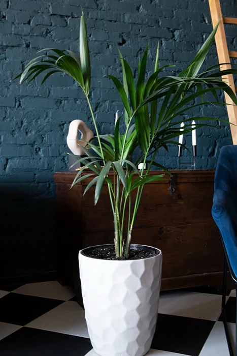 Формы преимущественно вертикальные: высокие цилиндры, усечённые конусы, асимметричные ёмкости. Цветовая палитра — нейтральная (чёрный, белый, серый, бежевый) с возможным одним тёплым акцентом (охра, бордо, изумруд) для подчёркивания окраски листвы. Решения органично интегрируются в озеленение офисов, ресторанов и общественных пространств с современным дизайном.