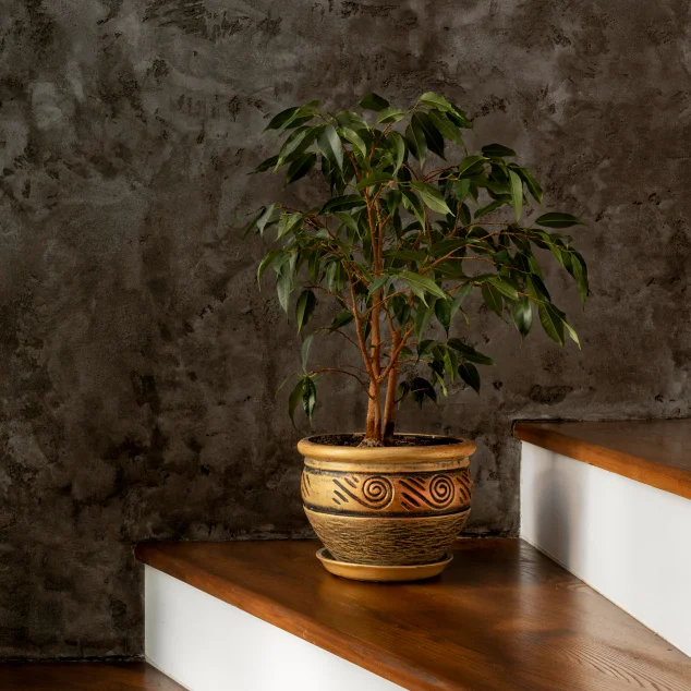Предпочтение отдаётся кашпо из натуральных или имитирующих природу материалов: терракота, обожжённая глина, керамика с эффектом старения, камень, бетон, плетёные корзины с влагозащитной вставкой. Цвета — природные: белый, бежевый, терракотовый, серый, охристый. Формы — амфоры, урны, цилиндры или лаконичная геометрия с правильными пропорциями. Фактурная поверхность, патина и ручная роспись усиливают эффект аутентичности и подчёркивают качество фитодизайна и озеленения помещений.