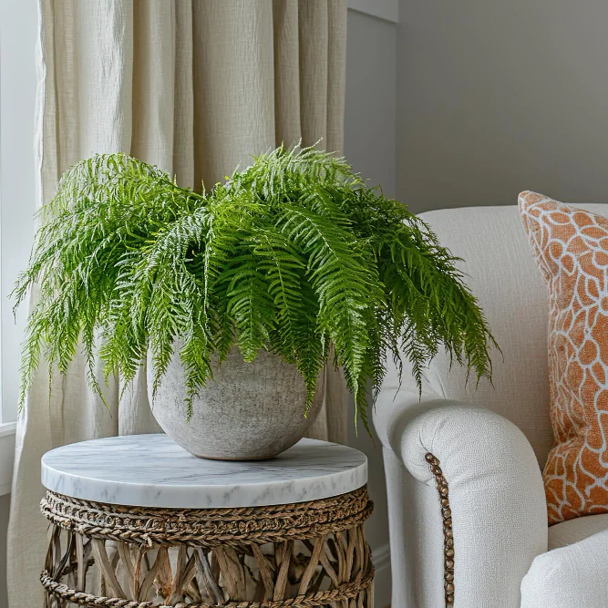 - Папоротники (нефролепис, adiantum) — эффект влажной тропической среды